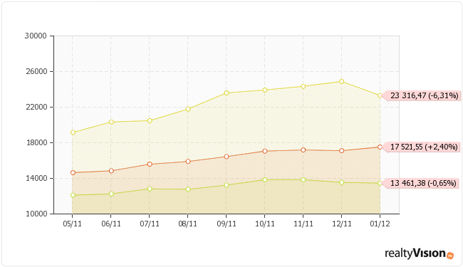 В январе 2012 года по сравнению с предыдущим месяцем увеличиласть стоимость аренды 2-комнатных квартир (+2,40%) и комнат (+3,46%). Уменьшилась стоимость аренды 1-комнатных (-0,65%) и 3-комнатных квартир (-6,31%).